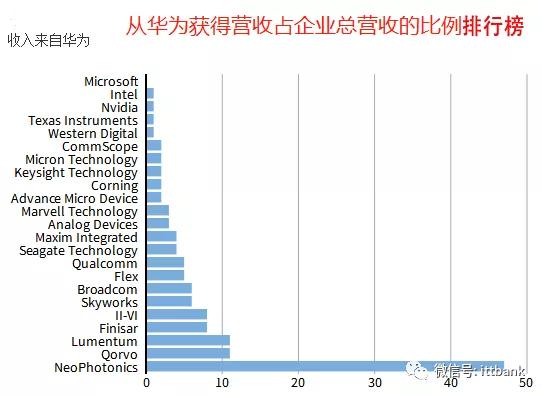 從上圖可知,對華為依賴最高的企業(yè)是NeoPhotonics,這家企業(yè)有47%的營收是來自華為。早在2008年,時任NeoPhotonics公司董事局主席兼CEO Tim Jenks就表示,他們已經(jīng)成為了華為最大的光器件供應(yīng)商。而根據(jù)國信證券的數(shù)據(jù),從2007年到2017年的整整十年,國內(nèi)客戶占該公司的營收比一度高達(dá)68%。其次是Qorvo、Lumentum、Finisar、II-VI、Skyworks等一系列廠商。