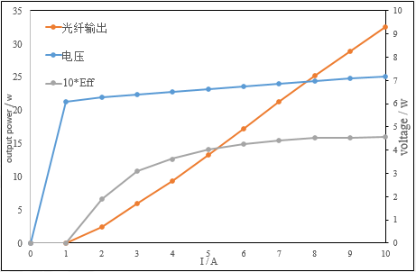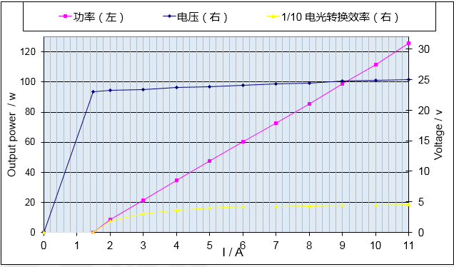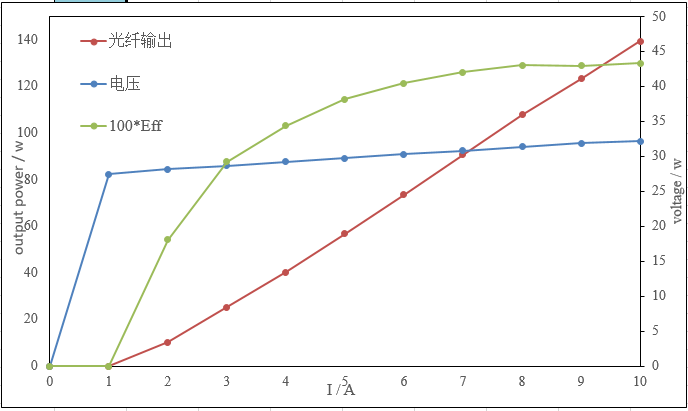 (1)808nm泵浦源產(chǎn)品,400μm輸出光纖芯徑輸出功率25W-120W(如圖4,5),波長(zhǎng)范圍控制在±3nm,光譜寬度(FWHM)<3nm,經(jīng)客戶(hù)實(shí)測(cè)光光轉(zhuǎn)換效率達(dá)到53%。