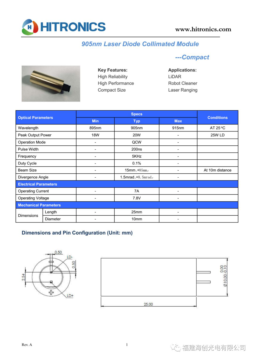 (由于客戶保密需求,此處僅展示海創(chuàng)自主研發(fā)的905nm激光模組,拋磚引玉)