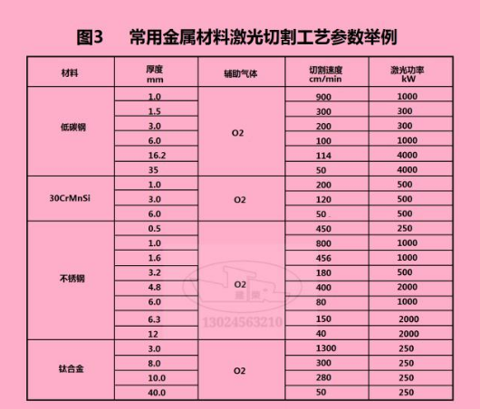 噴嘴的結(jié)構(gòu)形狀也影響激光切割質(zhì)量和效率,不同切割機采用不同形狀的噴嘴。常用的噴嘴形狀有:圓柱形、錐形、所方形等形狀。激光切割一般采用同軸(氣流與光軸同心)噴嘴,如氣流與光軸不同軸,那么在切割時易產(chǎn)生大量的飛濺。為保證切割過程的穩(wěn)定性,通常要減小噴嘴端面與工件表面的距離,一般為0.5~2.0mm,以便切割順利進行。常用金屬材料激光切割的工藝參數(shù)見圖3。
