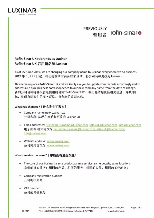附件:Luxinar Ltd.全球銷售總監(jiān)Andrew Chambers先生關(guān)于啟用新品牌的通告函。