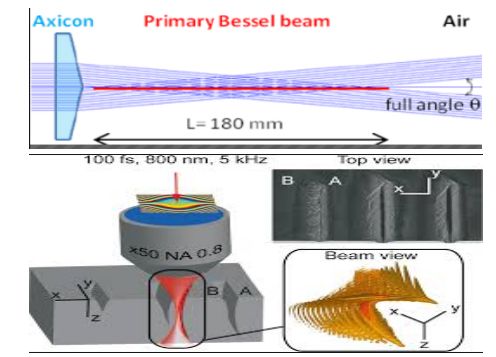 圖4 超快激光切割LCD方案原理示意:(a)貝塞爾光束,b貝塞爾光束貫穿玻璃