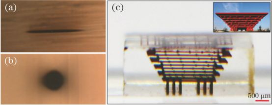 3Foturan玻璃中(a)傳統(tǒng)聚焦和(b)時空聚焦焦點的截面顯微圖像; (c)利用時空聚焦系統(tǒng)在Foturan玻璃內(nèi)部直寫的中國館結(jié)構(gòu)