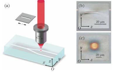 圖1(a)飛秒激光狹縫整形直寫的實驗裝置示意圖; (b)傳統(tǒng)方式聚焦直寫的波導截面; (c)狹縫整形直寫的波導截面