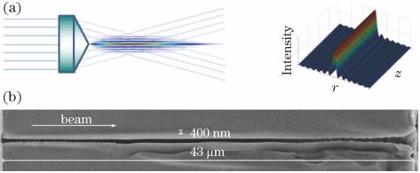 4(a)角錐棱鏡產(chǎn)生的貝塞爾光束及其光強分布示意圖; (b)使用貝塞爾光束在玻璃中制備高深徑比的納米通道SEM圖像