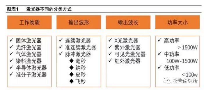 激光器有多種分類方法,其中最常用的分類方法有四種,包括以工作物質(zhì)分類、以能量輸出波形(工作方式)分類、以輸出波長(顏色)分類、以功率大小分類等。