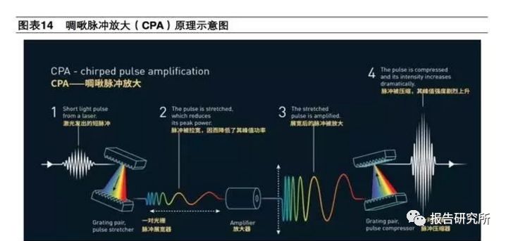 CPA技術(shù)的基本原理是先利用一對光柵將初始脈沖激光拉寬,利用放大器把拉寬的激光放大,最后使用另一對光柵將激光脈沖壓縮,得到瞬時的高功率。