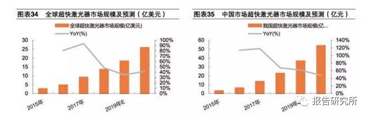 全球來看超快激光處于快速發(fā)展階段,根據(jù)中國科學(xué)院武漢文獻情報中心的統(tǒng)計和預(yù)測,2017年全球超快激光器市場規(guī)模超過9億美元,到2020年有望超過25億美元;2017年我國超快激光器市場約13.5億RMB,預(yù)計2020年將超過50億RMB。