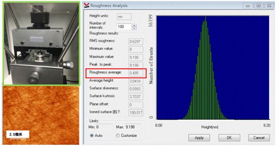 超光滑表面除了面形精度和表面粗糙度要求極高以外,還要求表面有完好的晶格結(jié)構(gòu)、無缺陷,能消除加工損傷層。關(guān)鍵在最后一道工序:超精密拋光技術(shù)。波長光電的超光滑表面加工工藝結(jié)合了傳統(tǒng)的機(jī)械去除法以及磁性拋光法,達(dá)到表面粗糙度低于5?。原子力顯微鏡的測試結(jié)果如圖一。