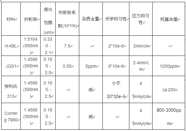 對于紫外、YAG光纖和半導(dǎo)體激光器等,常用的光學(xué)元件材料有H-K9L、紫外熔石英(JGS1)、賀利氏313和康寧7980等。相比較于K9玻璃,石英玻璃有更低的熱膨脹系數(shù),更少的雜質(zhì)含量,更好的光學(xué)均勻性,因而受到高功率激光市場的青睞。在高功率和超快激光應(yīng)用領(lǐng)域,國內(nèi)廠家更傾向于國外的賀利氏和康寧材料。