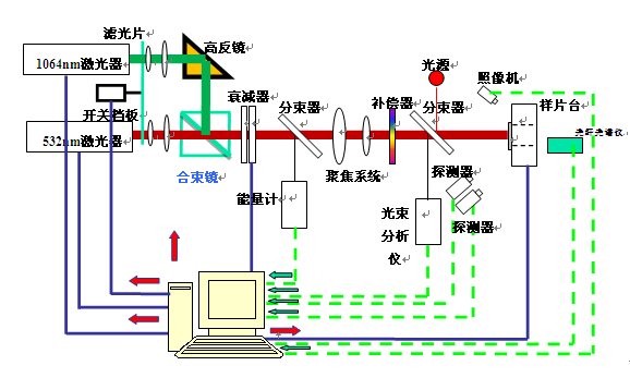 該系統(tǒng)具有一下三種特點(diǎn)及優(yōu)勢:首先,相互補(bǔ)充、互為校對的多種損傷判別方法。每種損傷判別方法都有一定的局限性和應(yīng)用范圍,單一的損傷判別方法難以對不同厚度、不同膜系的薄膜均做出準(zhǔn)確的判別。本套系統(tǒng)集成了多種檢測方法:圖像檢測、散射檢測、光譜檢測、聲譜檢測等,這些方法相互補(bǔ)充、互為校對,拓展了測試對象的應(yīng)用范圍,為整體系統(tǒng)的測試穩(wěn)定提供了有力的保障。其次,高倍率的樣品在線檢測復(fù)核系統(tǒng)。由于工作距的限制,目前測試系統(tǒng)中圖像判別法采用的CCD放大倍率只能達(dá)到50倍以下,不滿足國際標(biāo)準(zhǔn)規(guī)定的100倍的要求。對此,系統(tǒng)配備了高倍變焦顯微鏡校驗(yàn)系統(tǒng),方便用戶在不影響測試過程,不拆卸樣品的情況下,對損傷點(diǎn)的實(shí)際情況進(jìn)行在線復(fù)查,保證了對準(zhǔn)精度。另外,雙波長共光路的系統(tǒng)設(shè)計(jì)。本儀器具有單波長(1064nm或者532nm)和雙波長(1064nm和532nm)兩種類型。針對雙波長測試儀,采用兩臺激光器,經(jīng)過合色棱鏡,合并在一束光路上,簡化了光學(xué)系統(tǒng)結(jié)構(gòu),可對同一點(diǎn),實(shí)現(xiàn)雙波長激光的同時(shí)預(yù)處理。