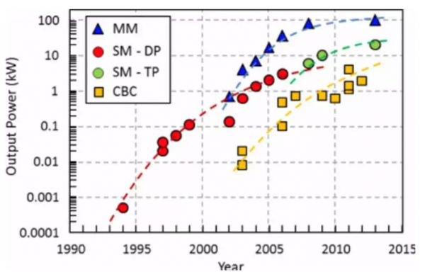 激光技術(shù)以其良好的遠(yuǎn)距傳輸特性和高能量密度,早在80年代就以化學(xué)激光器為代表進(jìn)入軍工領(lǐng)域。但是化學(xué)激光器的低輸出穩(wěn)定性和低光電轉(zhuǎn)換效率帶來的高能耗、龐大的體積和重量,使得激光武器長期只能夠以大型波音飛機(jī)為載體,而且實(shí)用化進(jìn)展緩慢。光纖激光器在20世紀(jì)90年代開始的高速發(fā)展,以及光纖激光器天然的高電光轉(zhuǎn)換效率和單模態(tài)輸出能力,贏得了軍工領(lǐng)域的重點(diǎn)關(guān)注,帶來了在以大模場摻鐿光纖、高亮度976nm泵浦二極體、高功率單模光纖激光器等方向?yàn)榇淼墓饫w激光器技術(shù)上的大規(guī)模研發(fā)投入。軍工方面的大規(guī)模投入也推動光纖激光器技術(shù)升級的高速發(fā)展,如下圖所示,單模光纖激光器的輸出功率從1994年公開報道的不到1W到2013年的超過10kW輸出功率。