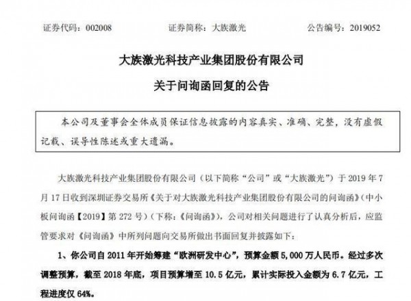 7月21日,大族激光回應(yīng)了深交所于7月17日發(fā)送的問詢函,回應(yīng)了外界對其建設(shè)多年尚未完工、并多次增加投資預(yù)算的歐洲研發(fā)中心項(xiàng)目