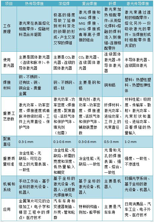 根據(jù)工作原理的不同,適配不同的加工場景,激光焊接可分為熱傳導(dǎo)焊、深熔焊、復(fù)合焊接、激光釬焊和激光傳導(dǎo)焊接五種,具體如下: