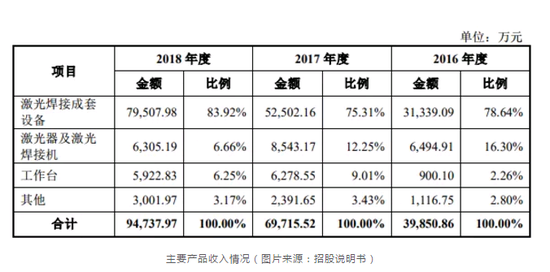 按產(chǎn)品劃分,公司產(chǎn)品主要以激光焊接自動化成套設備為主。報告期間,這一項的收入占主營業(yè)務收入比例分別為78.64%、75.31%和83.92%,總體呈上升趨勢。此外,激光器及激光焊接機、工作臺和其它產(chǎn)品占比較低。