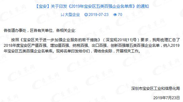 7月23日,深圳市寶安區(qū)工業(yè)和信息化局印發(fā)2019年寶安區(qū)五類百強企業(yè)名單庫,包括產(chǎn)值百強、增加值百強、納稅百強、出口百強、創(chuàng)