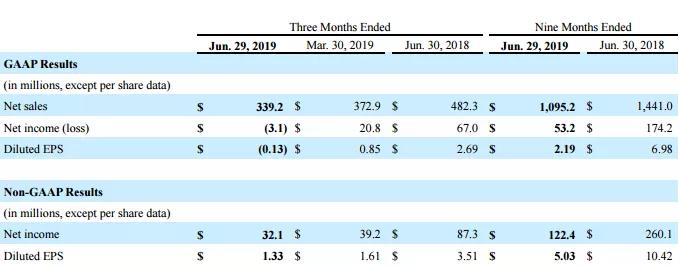 相干公司表示,2019財(cái)年第三季度與預(yù)估的遣散費(fèi)和庫存沖銷相關(guān)的重組費(fèi)用為2090萬美元,這是造成本財(cái)季GAAP凈虧損的主要因素。而在2018年財(cái)年第三季度,凈銷售額為4.823億美元,凈利潤為6700萬美元,每股攤薄收益2.69美元;2019財(cái)年第二季度,凈銷售額為3.729億美元,凈利潤為2080萬美元,每股攤薄收益0.85美元。