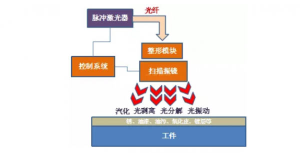 脈沖激光器發(fā)生高能脈沖激光,并通過光纖傳導至整形模塊,由單軸或雙軸掃描振鏡反射后照射到工件表面的污垢層,對工件表面的銹、油漆、油污、氧化皮、鍍層等附著層產(chǎn)生汽化、光剝離、光分解、光振動后實現(xiàn)清洗的目的。