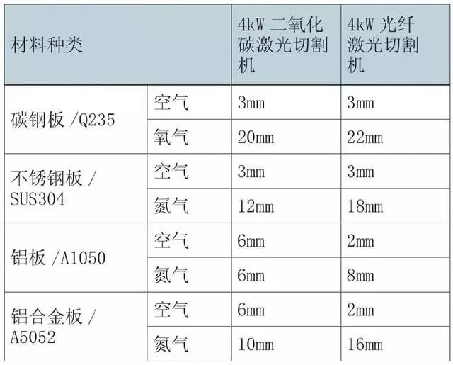二氧化碳激光切割機(jī)和光纖激光切割機(jī)使用空氣作為輔助氣體時(shí)的切割加工范圍如表2所示。