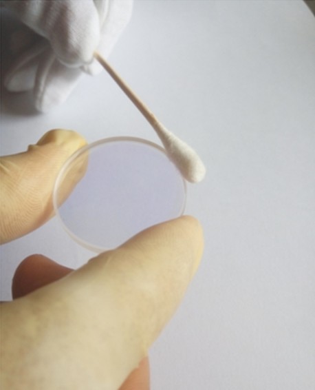 3.用無水乙醇迅速潤濕一根絨頭棉簽,然后用它輕輕地對鏡片表面進行徹底清潔。用棉簽的頭部蓋住整個表面,盡可能多地清除拋光液殘留物。