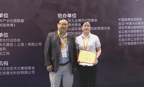 銀獎獲得者:濟(jì)南金威刻激光。由澳龍制造(江門)有限公司總經(jīng)理袁青頒發(fā)。