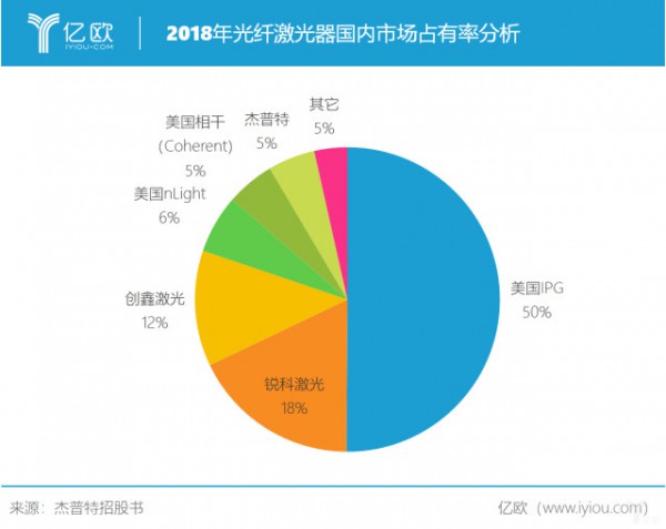 從2018年光纖激光器的市場占有率來看,開創(chuàng)了中國商用脈寬可調(diào)高功率脈沖光纖激光器先河的杰普特,也難逃被巨頭排擠的厄運。數(shù)據(jù)表明,2018年杰普特的光纖激光器份額僅占國內(nèi)市場的5%,以美國IPG為主的光纖激光器企業(yè)占領(lǐng)了國內(nèi)60%的市場份額。