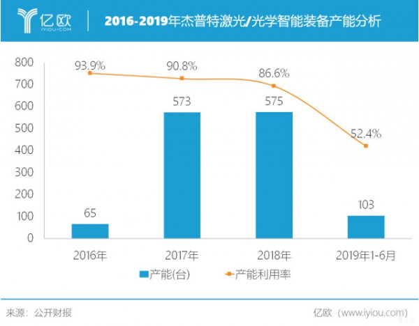 事實上,杰普特的總利潤下滑還與其激光/光學(xué)智能裝備產(chǎn)能驟減密不可分。從近幾年的激光/光學(xué)智能裝備產(chǎn)能來看,其產(chǎn)品產(chǎn)能在2017年和2018年分別為573臺和575臺,但在今年的上半年,驟降至103臺,與前兩年同期對比差距較大,杰普特準(zhǔn)備切換“戰(zhàn)術(shù)”了嗎?