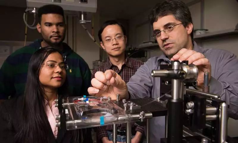 右側(cè):John Marciante研制了一個準(zhǔn)確測量光纖的裝置,左起分別為研究生Swati Bhargava,Christopher Marsh 15和研究生Yao Haomin,大家一起在Goergen 大廳的實驗室參加會議。圖片來源:羅切斯特大學(xué)照片/ J. Adam Fenster
