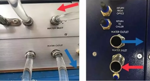 如較長時(shí)間內(nèi)不使用激光器,需排空激光器中冷卻液。簡單的放水是無法排凈的,我們可以借助外部氣體導(dǎo)入將冷卻液徹底排空。具體方法為,將進(jìn)水口的水管從激光器上拆下來,用壓縮氣體(壓力<3bar)對進(jìn)水口進(jìn)行同期,直到將內(nèi)部水路的殘余冷卻液從出水口排干凈為止,如下圖所示。