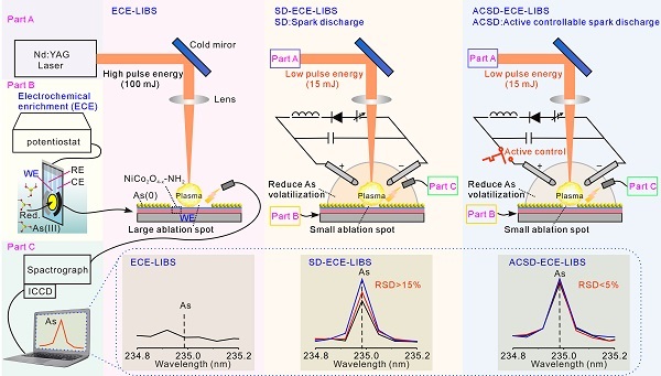 圖:電化學-LIBS設(shè)備,火花放電-電化學-LIBS設(shè)備和主動可控火花放電-電化學-LIBS設(shè)備檢測As(III)的示意圖