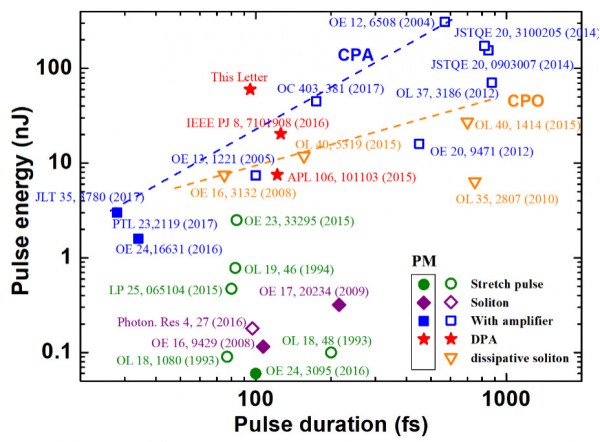 1.56μm波段飛秒脈沖激光在激光通信、醫(yī)療診斷、微納加工、精密測量等領(lǐng)域具有廣泛的應(yīng)用價值。特別是,通過光學(xué)倍頻技術(shù),1.56μm倍頻激光器可工作鈦寶石激光器的輸出波段,致其應(yīng)用場景進一步拓展。當(dāng)前,鈦寶石振蕩器和放大器產(chǎn)品發(fā)展成熟,在極短脈沖(<20fs)和超大能量(>1mJ)方面具有顯著的指標(biāo)性優(yōu)勢。相較于鈦寶石激光器,摻鉺光纖飛秒激光器產(chǎn)品在50-100fs脈沖寬度和<10nJ單脈沖能量方面具有顯著的性價比優(yōu)勢。進一步綜合光纖激光器的高效率、免維護、環(huán)境適應(yīng)性強等優(yōu)勢,摻鉺光纖飛秒激光器已成為鈦寶石激光器的理想替代光源。據(jù)了解,輸出功率在百毫瓦量級的780/1560nm飛秒激光器國內(nèi)每年有約300臺的市場容量,且科研市場逐年增長。限制1.56μm波段飛秒脈沖功率提升和脈沖壓縮的關(guān)鍵技術(shù)問題是非線性和色散管理。通常,啁啾脈沖放大技術(shù)(chirped-pulse amplification, CPA)是克服非線性效應(yīng)的一種主要手段,該技術(shù)在800nm鈦寶石激光器和1.03μm摻鐿光纖激光器中應(yīng)用廣泛。然而,由于光柵壓縮器的衍射效率、結(jié)構(gòu)復(fù)雜、高階色散等問題,CPA技術(shù)在1.56μm波段的發(fā)展并不順利。此外,考慮到通過增加腔內(nèi)光纖長度較容易降低脈沖重復(fù)頻率,即可利用啁啾脈沖振蕩(chirped-pulse oscillation, CPO)技術(shù)直接從振蕩器產(chǎn)生高能量超短脈沖。圖1中的藍色和橙色虛線分別描述了利用CPA和CPO技術(shù)獲取到的脈寬和能量趨勢曲線。近年,分離脈沖放大(divided-pulse amplification, DPA)或稱為相干脈沖合成(coherent beam combination, CBC)技術(shù)已逐漸成為1.03μm波段產(chǎn)生千瓦平均功率超短脈沖的主要手段。該技術(shù)基于偏振分束將種子光進行能量分配,分別注入多個放大器中進行能量提升,可按比例降低放大器中脈沖的峰值功率,進而有效管理放大脈沖非線性效應(yīng)。