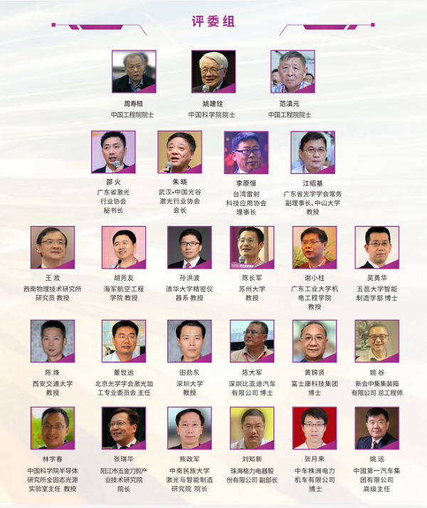 被譽(yù)為國內(nèi)激光行業(yè)最高榮譽(yù)的獎(jiǎng)項(xiàng),擁有龐大、專業(yè)、權(quán)威的評(píng)審團(tuán),以中國工程院院士周壽桓、中國科學(xué)院院士姚建銓為顧問,中國工程院院士范滇元為評(píng)審組長;邀請(qǐng)到廣東省激光行業(yè)協(xié)會(huì)、武漢中國光谷激光行業(yè)協(xié)會(huì)、臺(tái)灣雷射科技應(yīng)用協(xié)會(huì)、廣東省光學(xué)學(xué)會(huì)的理事長、秘書長等擔(dān)任副組長;另有清華大學(xué)、西安交通大學(xué)、西南技術(shù)物理所、海軍航空大學(xué)、廣東工業(yè)大學(xué)、陽江五金刀剪研究院、裝甲兵工程學(xué)院、蘇州大學(xué)、五邑大學(xué)等知名單位的激光專家,以及來自比亞迪、富士康、格力電器、中集集裝箱、中車株洲、長春一汽等大型企業(yè)的技術(shù)高管擔(dān)任評(píng)委。