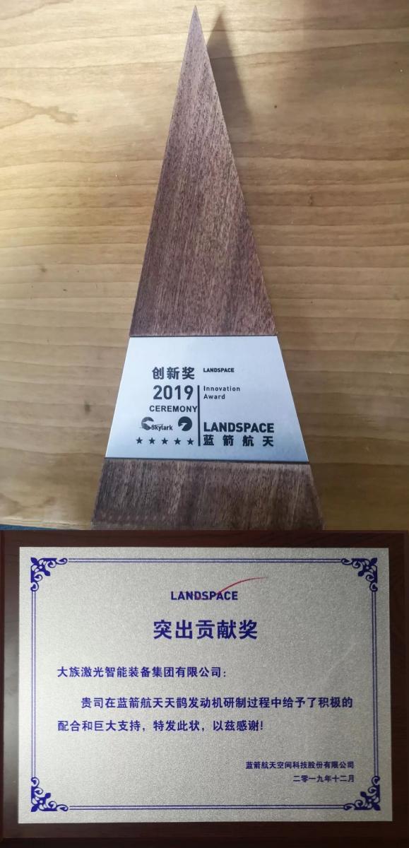 大族激光智能裝備集團(tuán)榮獲藍(lán)箭航天頒發(fā)的“2019創(chuàng)新獎(jiǎng)”、“突出貢獻(xiàn)獎(jiǎng)”。高功率激光焊接銷售總部總經(jīng)理王祥出席接受頒獎(jiǎng),并作發(fā)言。
