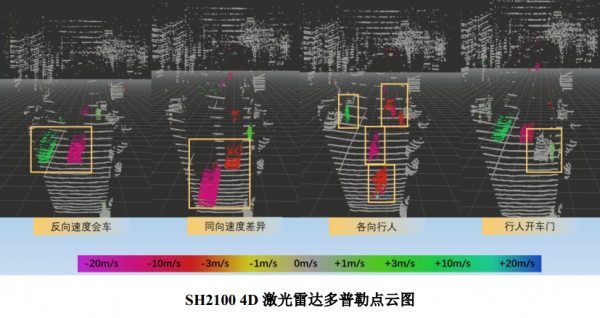 下圖-c為逆行目標(biāo)接近雷達(dá)設(shè)備(10m)時(shí)的相機(jī)成像效果,由于出租車的遮擋,相機(jī)圖像或毫米波已無法發(fā)現(xiàn)隱藏在出租車后的逆行駛摩托。SH2100具備全回波的目標(biāo)多普勒探測(cè)能力,發(fā)射的激光穿透出租車車窗玻璃獲得目標(biāo)的距離和多普勒?qǐng)D像,革命性的提高了自動(dòng)駕駛動(dòng)目標(biāo)識(shí)別與分類能力。