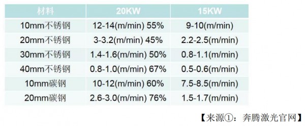 過去幾年內(nèi)工業(yè)應(yīng)用的激光器功率不斷提高,從最開始的200W、500W、800W、1000W、1500W 到現(xiàn)在的 2000W、3000W、6000W、12000W 甚至部分客戶已經(jīng)開始使用的 15000W、20000W。在一定范圍內(nèi),激光加工效率一般隨著功率的提升呈現(xiàn)一定的非線性提高,如奔騰激光發(fā)布的 20000W 激光切割設(shè)備相比較 15000W 設(shè)備,平均加工效率提高 50%以上,但是功率僅提高 33%,呈現(xiàn)出隨著功率的提升,設(shè)備的效率功率提高比大于 1,具體如下所示: