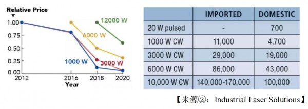 隨著光纖激光器市場規(guī)模的不斷擴大、激光產(chǎn)業(yè)鏈的不斷成熟,激光器的核心器件國產(chǎn)化率不斷提高,激光器的成本不斷下降。如下圖所示,國內(nèi)典型光纖激光器企業(yè)銳科激光及創(chuàng)鑫激光自 2016 年以來每年的成本下降幅度均超過20%,市場規(guī)模的擴大和產(chǎn)業(yè)鏈的不斷細化使得激光器的原材料材料呈現(xiàn)出不斷下降的趨勢。