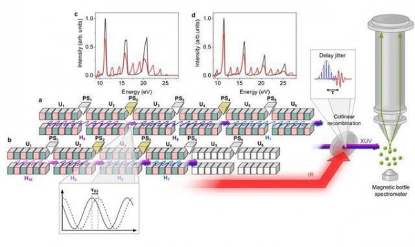 阿秒脈沖由短時間激光諧波重疊造成??茖W(xué)家使用FERMI提供的振蕩器產(chǎn)生了一組四個基本波長的激光諧波。這些設(shè)備,可操縱相對論電子束的運(yùn)動,從而產(chǎn)生紫外線。該實(shí)驗(yàn)的主要挑戰(zhàn)之一是這些相對相的測量,其特征是通過結(jié)合阿秒脈沖和紅外場來獲取從氖原子釋放的光電子。這導(dǎo)致電子光譜中出現(xiàn)其他結(jié)構(gòu),通常稱為邊帶??茖W(xué)家們測量了每次激光發(fā)射產(chǎn)生的不同邊帶之間的相關(guān)性。最終,這使他們能夠充分表征阿秒脈沖序列。