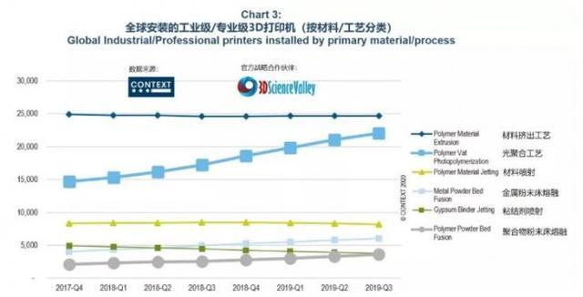 根據(jù)3D科學(xué)谷戰(zhàn)略合作伙伴Context的研究,在過去連續(xù)12個(gè)月(2018 第四季度-2019年第三季度)中,工業(yè)級(jí)/專業(yè)級(jí)3D打印機(jī)使用的塑