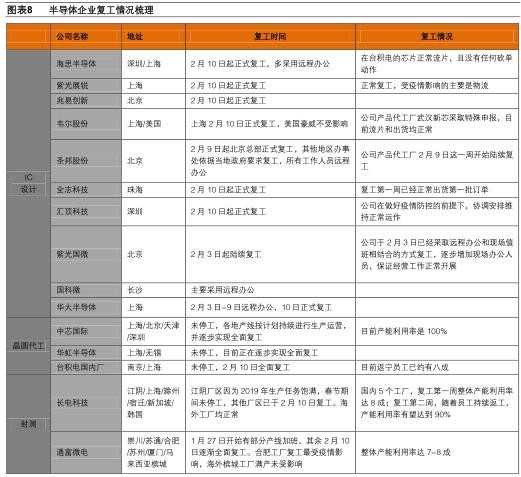 最近兩周,我們對(duì)產(chǎn)業(yè)復(fù)工情況進(jìn)行了追蹤,驗(yàn)證了我們原先看法的正確性。從業(yè)界了解的信息顯示,目前晶圓代工和封測訂單仍比較滿,晶圓代工和封測廠商目前整體產(chǎn)能利用率超過了60%,仍是高于去年同期,且尚未出現(xiàn)砍單的情況。終端需求受到抑制,但是沒有影響到1季度晶圓代工和封測的訂單,我們總結(jié)有3點(diǎn)原因:1)2019Q3-2019Q4,IC設(shè)計(jì)公司的庫存已經(jīng)降到接近健康水平甚至以下的位置,2019Q4晶圓代工產(chǎn)能開始緊缺。春節(jié)前供不應(yīng)求的訂單,在春節(jié)后補(bǔ)貨仍存在慣性。2)IC設(shè)計(jì)公司目前庫存在健康水平甚至以下的位置,對(duì)庫存增加的容忍度較高,所以即使有1季度終端需求受疫情影響的預(yù)期,IC設(shè)計(jì)公司也尚未出現(xiàn)砍單的情況。3)業(yè)界普遍認(rèn)為疫情只是導(dǎo)致短期終端需求遞延,而不是憑空消失,因而IC設(shè)計(jì)公司也不會(huì)貿(mào)然砍晶圓代工和封測的訂單。