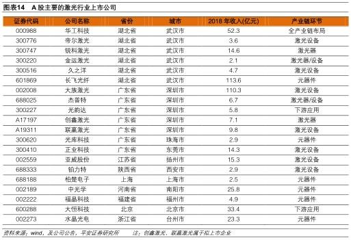 此次疫情爆發(fā),對(duì)國內(nèi)激光設(shè)備產(chǎn)業(yè)鏈公司額復(fù)工產(chǎn)生了一定的影響,尤其,此次最嚴(yán)重的疫區(qū)——湖北,是我國重要的激光產(chǎn)業(yè)集聚地之一。據(jù)我們統(tǒng)計(jì),目前A股激光行業(yè)上市公司共20家(含擬上市的兩家),其中武漢市的企業(yè)共6家,占比30%。若依照上市公司收入計(jì)算,2018年,武漢市激光行業(yè)上市公司收入合計(jì)約191億元,約占所有行業(yè)內(nèi)上市公司的42%。