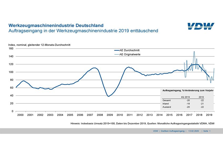 VDW(德國(guó)機(jī)床制造商協(xié)會(huì))預(yù)計(jì),2020年德國(guó)的機(jī)床產(chǎn)量將下降18%。VDW主席Heinz-Jürgen Prokop博士2月13日在法蘭克福舉行的年度新聞發(fā)布會(huì)上如是說(shuō):需求的下降在2018年下半年就已經(jīng)可以察覺(jué),并在2019年加速了。2018-2019年跌幅超過(guò)五分之二,已經(jīng)消化了積壓的訂單,這成為2020年德國(guó)機(jī)床行業(yè)發(fā)展的決定性因素。