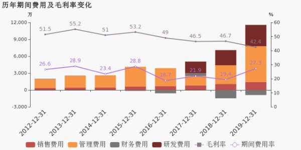 公司2019年營業(yè)成本2.3億,同比增長45.9%,高于營業(yè)收入35.1%的增速,導(dǎo)致毛利率下降4.3%。期間費用率為27.3%,較上年升高7.9%,對公司業(yè)績形成拖累。經(jīng)營性現(xiàn)金流大幅上升153.1%至7420.9萬。公司研發(fā)投入大幅增加,相比去年同期增長40.5%達到3782.3萬。研發(fā)投入全部費用化,不作資本化處理。