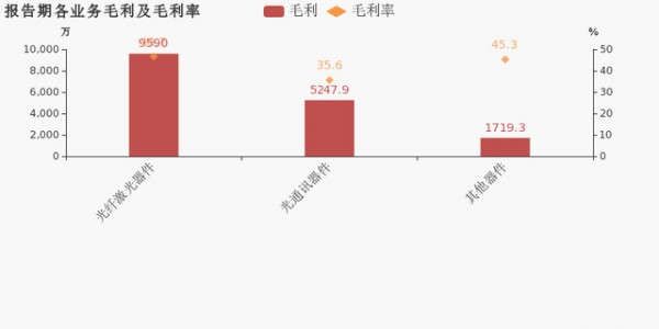 從業(yè)務(wù)結(jié)構(gòu)來看,“光纖激光器件”是企業(yè)營業(yè)收入的主要來源。具體而言,“光纖激光器件”營業(yè)收入為2.1億,營收占比為52.5%,毛利率為46.7%。