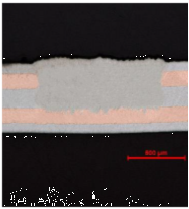 納秒脈沖光纖激光器的峰值功率較高,意味著可以較容易地以很小的平均功率進入銅等高反金屬中。使用納秒微焊接工藝作為焊接的一種替代方法,將元件直接貼合在銅印刷電路板(PCB)軌道上的研究顯示出了巨大的前景。目前已經(jīng)成功將厚達150μm的銅引線貼合到>60μm的沉積軌道上,而與FR4基板之間沒有任何明顯的分層。這為熱敏元件或工作溫度可能超過傳統(tǒng)焊接極限的元件的貼合提供了替代方案。