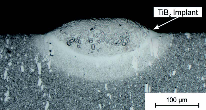 研究人員們計(jì)劃使用一種稱為激光植入的技術(shù)來(lái)解決這個(gè)問(wèn)題,該技術(shù)主要為——使用脈沖激光在表面內(nèi)使表面局部分散出鈦化合物(例如 TiN,TiC,TiB2 等鈦化合物制成)的硬陶瓷顆粒,來(lái)產(chǎn)生微結(jié)構(gòu)從而表現(xiàn)出耐磨性能。通過(guò)使用激光植入技術(shù),就可以在沖壓工具的表面上產(chǎn)生圓頂狀的微結(jié)構(gòu),尤其當(dāng)使用 TiB2 顆粒時(shí),可以提供高達(dá)1600維氏的硬度值。根據(jù) Spranger 的研究,這些微結(jié)構(gòu)已被證明在減少成形工具的磨損方面非常有效。