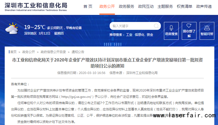 通知提出:為加強(qiáng)對(duì)企業(yè)擴(kuò)產(chǎn)增效扶持計(jì)劃專項(xiàng)資金的管理工作,自覺接受社會(huì)各界的監(jiān)督,現(xiàn)將2020年深圳市重點(diǎn)工業(yè)企業(yè)擴(kuò)產(chǎn)增效獎(jiǎng)勵(lì)項(xiàng)目第一批擬資助項(xiàng)目在我局官方網(wǎng)站(http://gxj.sz.gov.cn/)予以公示,向社會(huì)廣泛征求意見,歡迎社會(huì)各界監(jiān)督。