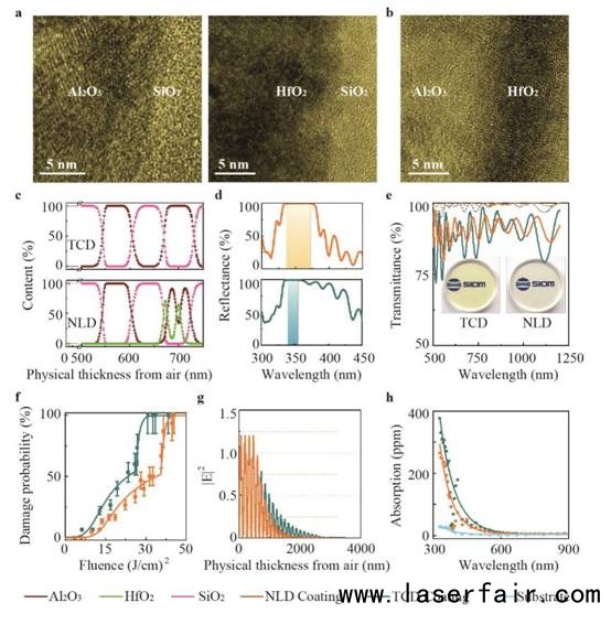 在這項(xiàng)工作中,研究團(tuán)隊(duì)展示了一種基于共蒸界面納米疊層的“集高反射率和高激光損傷閾值于一體”的反射薄膜設(shè)計(jì)方法。在這種設(shè)計(jì)方法中,采用兩種材料交替的納米疊層作為一層具有高折射率和大光學(xué)帶隙的等效層,取代傳統(tǒng)組合膜系設(shè)計(jì)中的高折射率膜層。在保持總光學(xué)厚度不變的前提下,通過改變納米疊層中兩種材料的厚度比例,可以調(diào)節(jié)納米疊層薄膜的(平均)折射率和光學(xué)帶隙。這使得發(fā)展出同時(shí)具備高反射率和高激光損傷閾值的紫外反射薄膜成為可能。隨后,研究團(tuán)隊(duì)使用電子束沉積技術(shù),在實(shí)驗(yàn)上證明了基于Al2O3-HfO2納米疊層的反射薄膜在紫外波段具有更高的反射率、帶寬和激光損傷閾值,適用于紫外激光領(lǐng)域。與傳統(tǒng)組合膜系設(shè)計(jì)相比,該納米疊層設(shè)計(jì)的紫外激光反射薄膜(兩者總膜層厚度接近)具有若干優(yōu)點(diǎn)。首先,納米疊層設(shè)計(jì)薄膜在紫外波段具有更高的反射率和更寬的帶寬,同時(shí)在可見至近紅外波段具有更低的透射波紋;其次,納米疊層設(shè)計(jì)薄膜中電場強(qiáng)度隨膜層深度衰減的更快,節(jié)瘤缺陷引起的電場增強(qiáng)更低,薄膜中的吸收更低,從而具有更高的紫外激光損傷閾值;最后,該技術(shù)適用于大尺寸(對角線尺寸達(dá)米級)激光薄膜的制備。研究團(tuán)隊(duì)利用納米疊層的折射率和光學(xué)帶隙可調(diào)諧的特性來設(shè)計(jì)超越傳統(tǒng)紫外激光薄膜性能的新型紫外激光反射薄膜,為提高激光薄膜綜合性能提供了一種重要的技術(shù)途徑?;诩{米疊層的激光薄膜設(shè)計(jì)思想在未來可以通過改變疊層材料種類和厚度比例進(jìn)一步拓展從而形成其他高綜合性能的激光薄膜元件。據(jù)悉,本論文的核心概念已提交了中國發(fā)明專利申請。