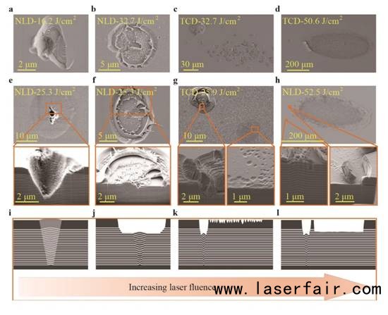 (a-h)SEM-FIB表征的激光損傷表面形貌圖和剖面形貌圖。