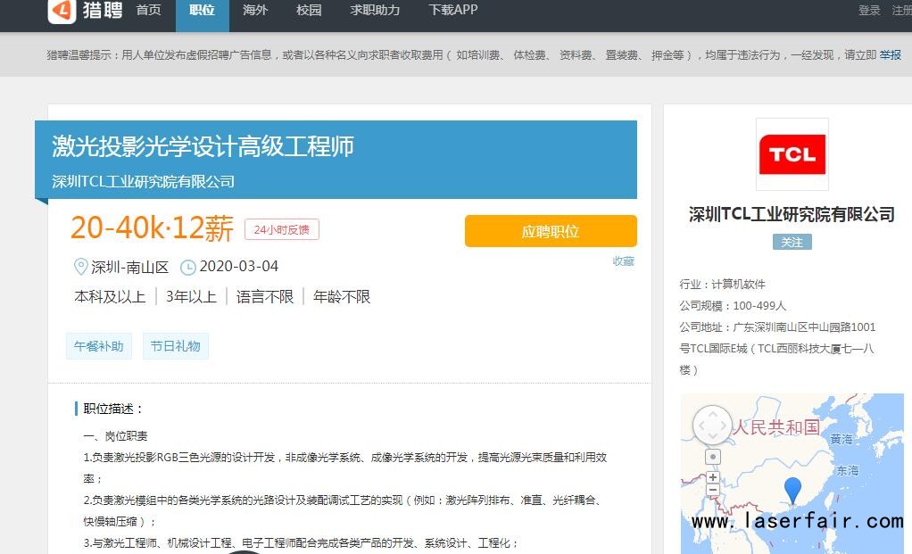因?yàn)椋@次招聘方是TCL旗下核心技術(shù)研發(fā)團(tuán)隊(duì)深圳TCL工業(yè)研究院有限公司,這個(gè)部門是TCL顯示技術(shù)最為重要的“核心研發(fā)機(jī)構(gòu)”,以深圳TCL工業(yè)研究院名義去招聘激光顯示技術(shù)人才,這背后意圖還是值得“揣摩”。