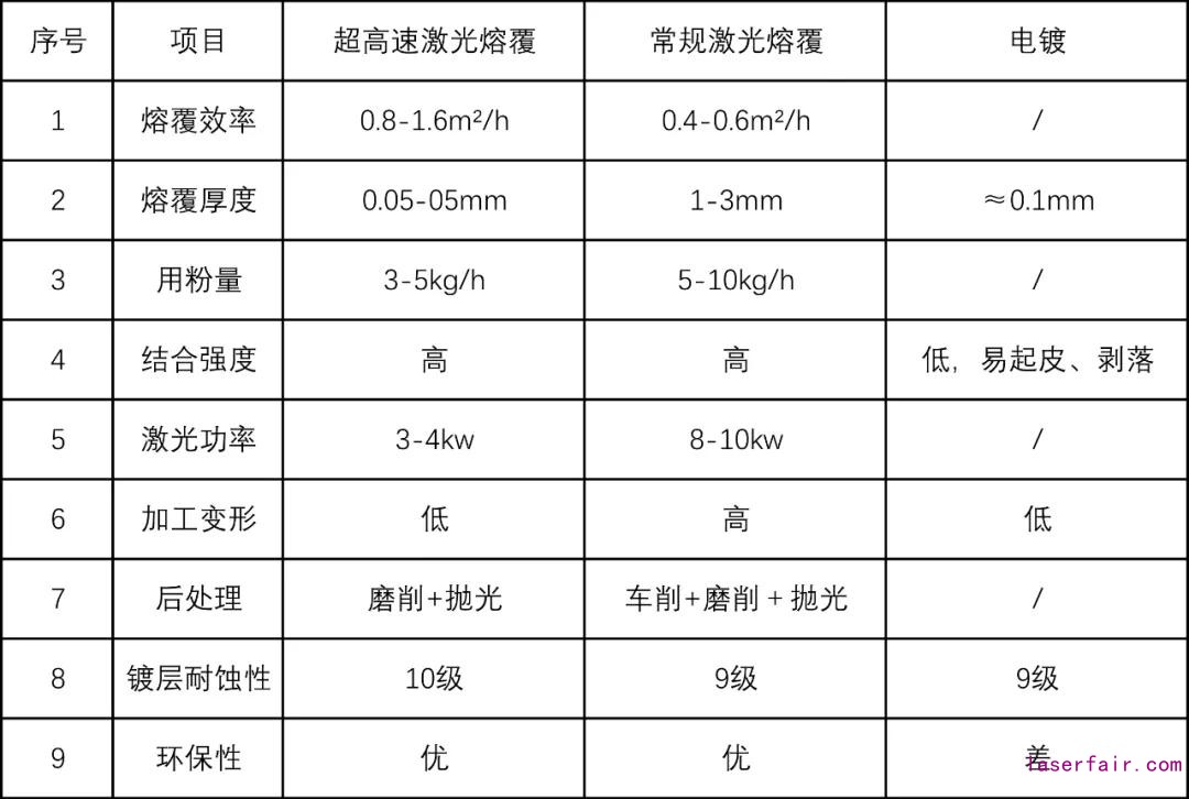 與傳統(tǒng)的電鍍和常規(guī)激光熔覆技術(shù)相比,超高速激光熔覆具有其獨(dú)特的優(yōu)勢(shì)。